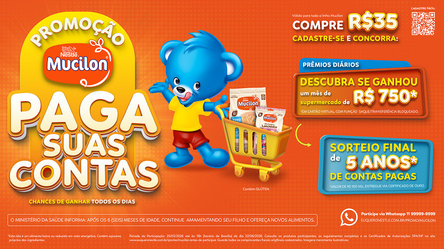 Durante o período de participação, o consumidor interessado deverá realizar compras, no valor mínimo de R$ 35,00 (trinta e cinco reais) e seus múltiplos, em produtos Nestlé da marca Mucilon, no mesmo comprovante fiscal eletrônico, e fazer sua inscrição, utilizando, à sua escolha, um dos meios permitidos (site da promoção: www.euqueronestle.com.br/promo/mucilon ou WhatsApp: (011) 91515-4050, seguindo as instruções informadas.